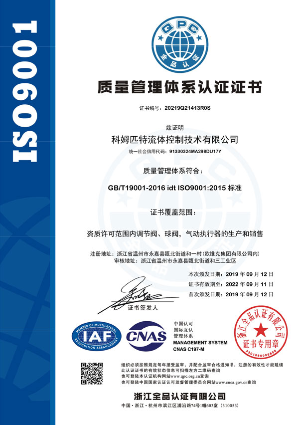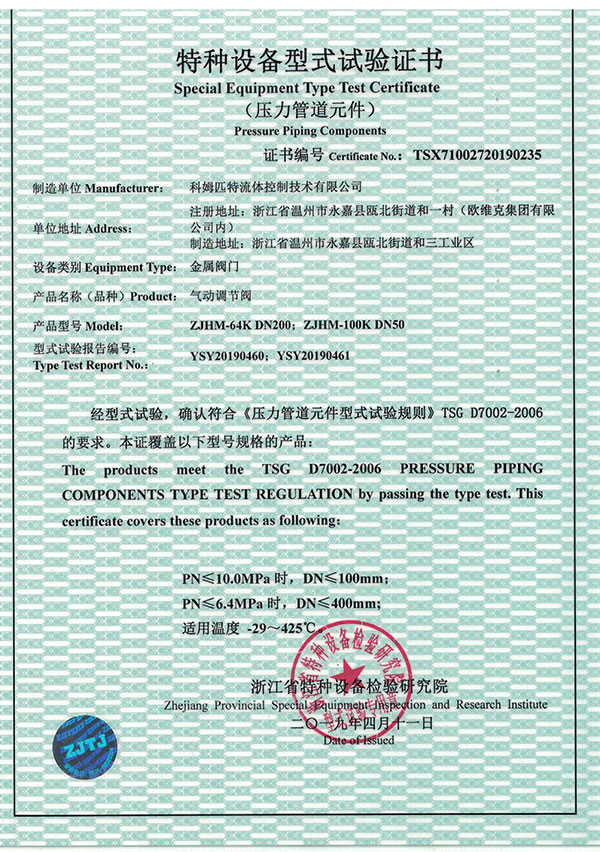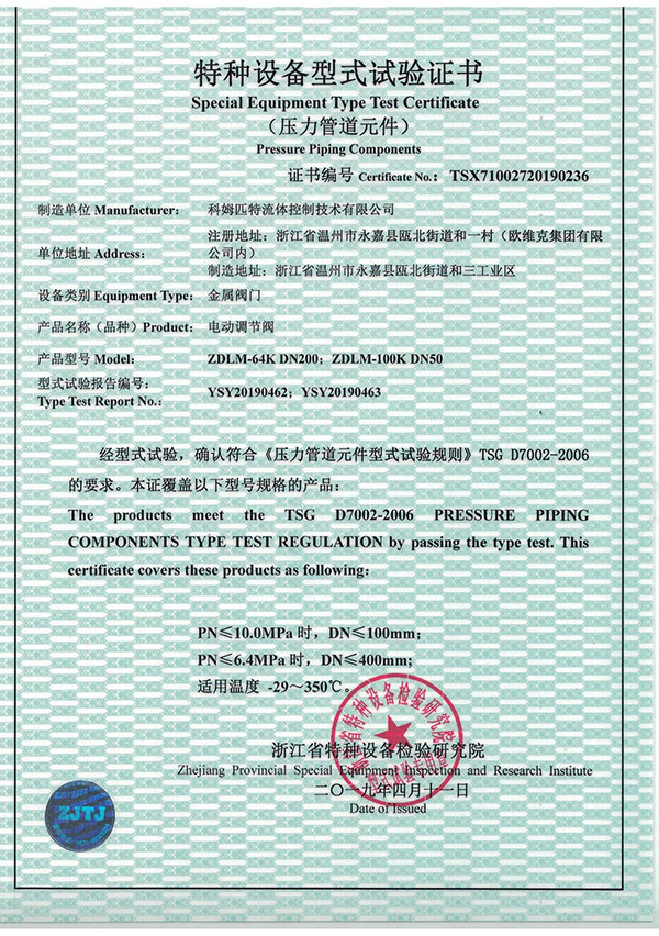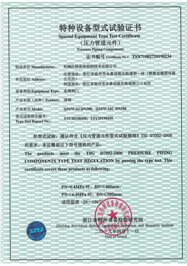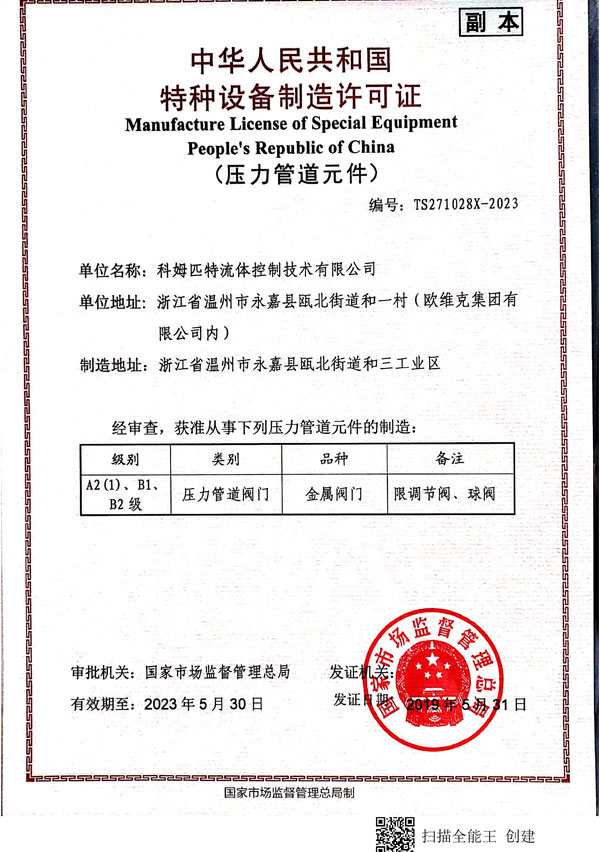 • 中华人民共和国特种装备制造允许证(调理阀、球阀)